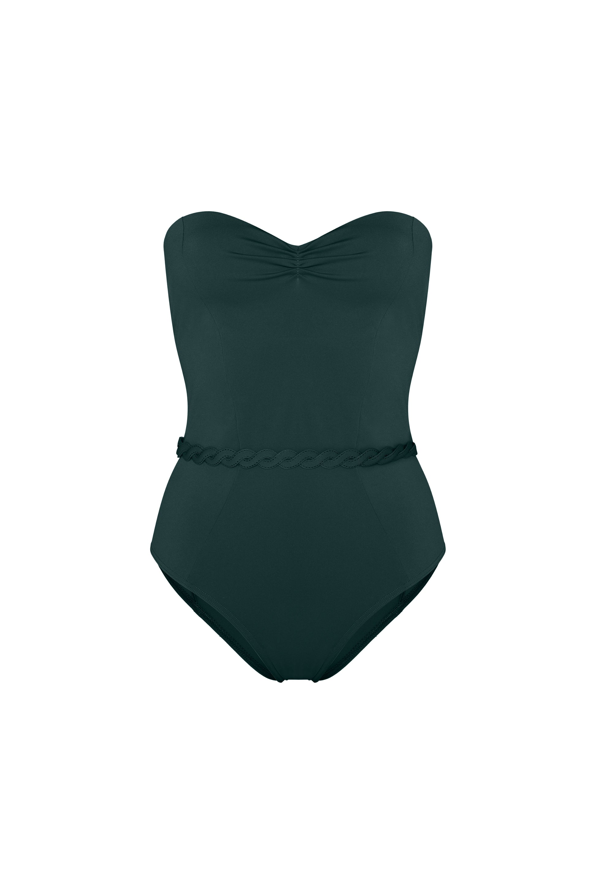 The KAIA swimsuit is very elegant. It features a solid bust padding for extra support and is constructed around geometric lines that define the body shape. A lasercut braid trim, that is a signature element of the collection, forms a belt effect that flatters the waist.