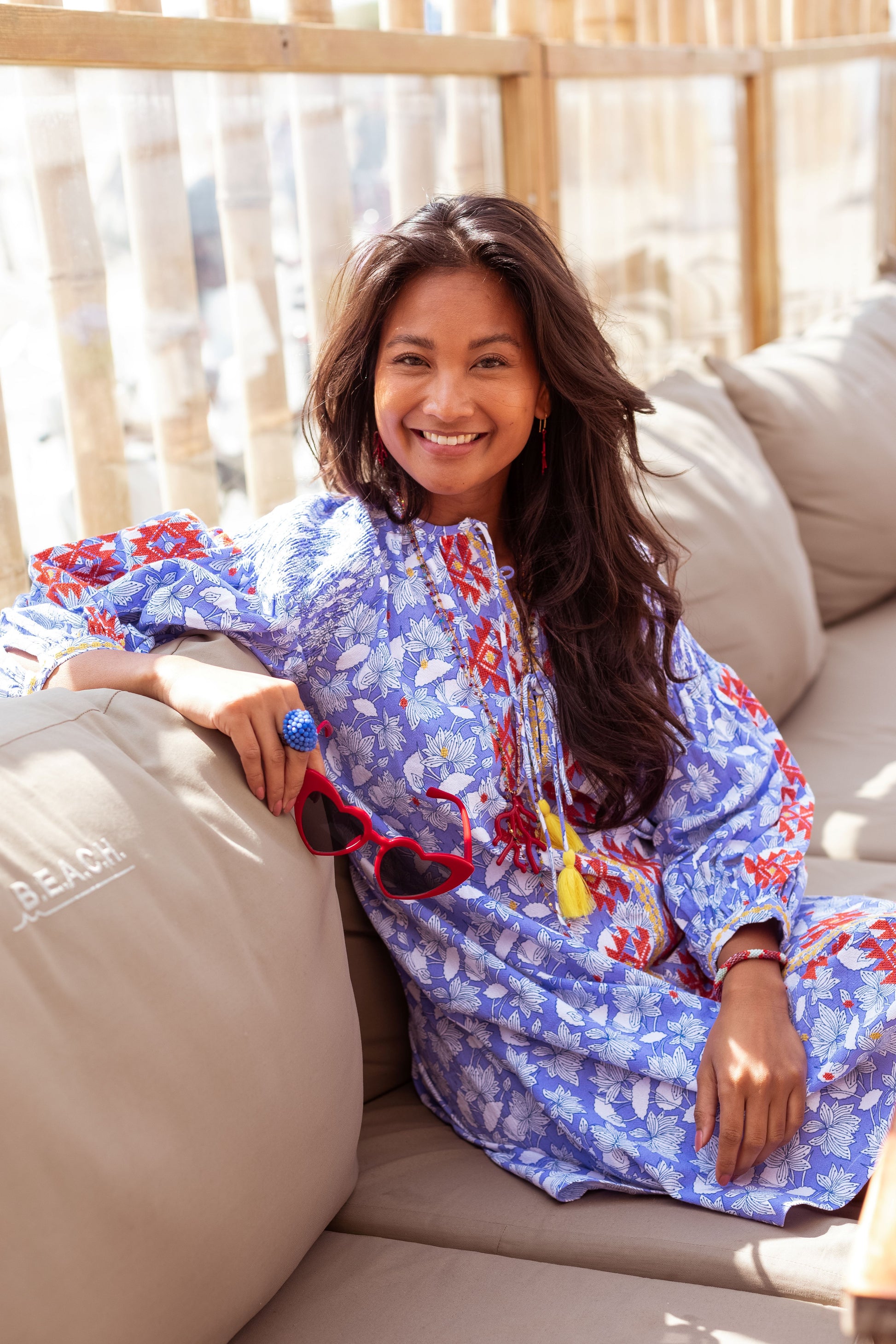 Light and breezy, this blue mini dress features vibrant orange embroidery and a playful yellow tassel - perfect for summer days.